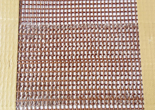 2.墻式接頭法:在網(wǎng)帶的兩頭分別用凱夫拉高溫布做圓柱狀的布條子,客戶也是直接用我們配好的鋼絲直接穿進(jìn)凱夫拉高溫布的小孔里面就行了。這種接頭方式的好處就是接頭處很耐磨,但是抗拉強(qiáng)度并不是很高。