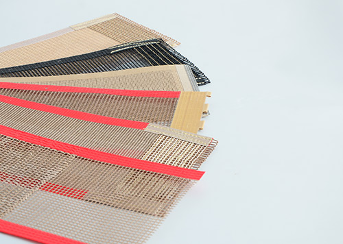 2.墻式接頭法:在網(wǎng)帶的兩頭分別用凱夫拉高溫布做圓柱狀的布條子,客戶也是直接用我們配好的鋼絲直接穿進(jìn)凱夫拉高溫布的小孔里面就行了。這種接頭方式的好處就是接頭處很耐磨,但是抗拉強(qiáng)度并不是很高。