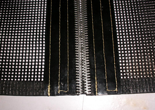 2.墻式接頭法:在網(wǎng)帶的兩頭分別用凱夫拉高溫布做圓柱狀的布條子,客戶也是直接用我們配好的鋼絲直接穿進(jìn)凱夫拉高溫布的小孔里面就行了。這種接頭方式的好處就是接頭處很耐磨,但是抗拉強(qiáng)度并不是很高。