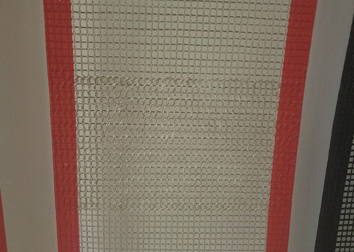 2.墻式接頭法:在網(wǎng)帶的兩頭分別用凱夫拉高溫布做圓柱狀的布條子,客戶也是直接用我們配好的鋼絲直接穿進凱夫拉高溫布的小孔里面就行了。這種接頭方式的好處就是接頭處很耐磨,但是抗拉強度并不是很高。