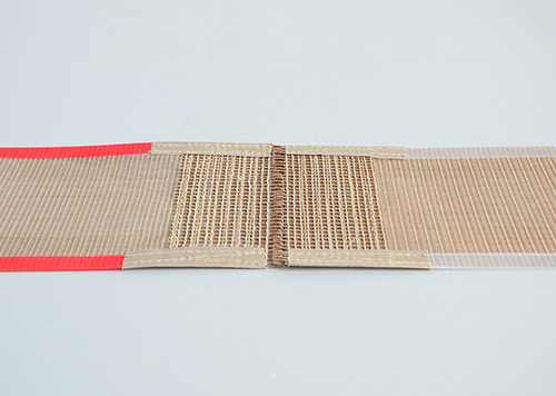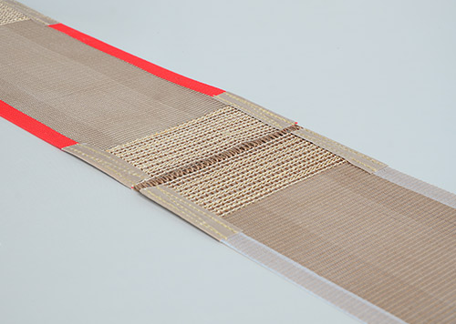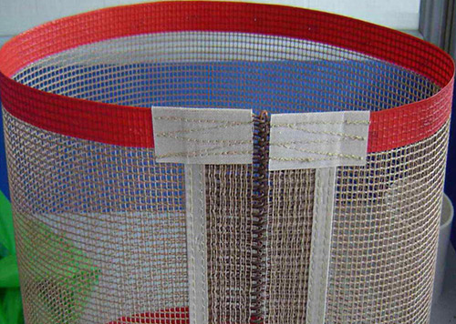 2.墻式接頭法:在網(wǎng)帶的兩頭分別用凱夫拉高溫布做圓柱狀的布條子,客戶也是直接用我們配好的鋼絲直接穿進(jìn)凱夫拉高溫布的小孔里面就行了。這種接頭方式的好處就是接頭處很耐磨,但是抗拉強(qiáng)度并不是很高。